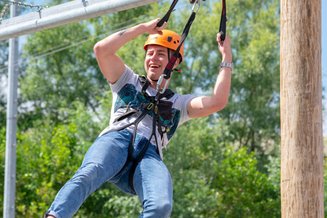 The Rollercoaster Zipline combines the speed of a zipline (also known as a zip line) with the thrill of a roller coaster! By means of a safe fuse, you are attached to this ''zip line'' and you can take off. Perfect for vrijgezellenfeesten and bedrijfsuitjes. But for the young adventurers among us, the Rollercoaster Zipline is also great fun for kinderfeestje and schoolreisje! You can take on the adventure from the age of 8 and 1.30 metres.